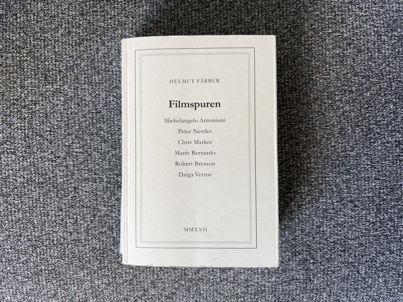 Das wahrscheinlich ungewöhnlichste Buch zum Kino in meiner Bibliothek bekam ich kurz nach dem Erscheinen vor vier Jahren vom Autor selbst überreicht. Helmut Färber ist bei Filmspuren auch der Verleger. Er hat davor schon mehrere Werke vollkommen unabhängig herausgebracht: Studien zu Renoir, Ozu, D.W. Griffith, Mizoguchi, und schon 1977 einen Band über Baukunst und Film. Aus der Geschichte des Sehens. Inhaltliche und publizistische Autonomie gehören für Färber zusammen. Autor sein heißt für ihn auch: Kontrolle über Typographie, Umbruch, Papier, Bindung. Filmspuren ist nun so etwas wie sein Lebenswerk. Nominell ein Buch über sechs Menschen des Kinos: Michelangelo Antonioni, Peter Nestler, Chris Marker, Mario Bernardo, Robert Bresson, Dziga Vertov. Bernardo war mir nicht geläufig.